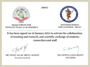 بتاريخ 19 كانون الثاني 2022 وقّع المنتدى العراقي للنخب والكفاءات مذكرة تفاهم مع معهد أناماتشاريا للعلوم والتكنولوجيا – الهند . وتأتي هذه الخطوة وفقاً للخطة المستقبلية التي اقرتها الأمانة العامة بمد جسور العلم والمعرفة مع الجامعات العراقية والعربية والدولية.