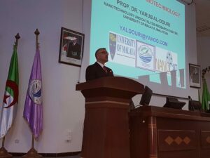 التدريسي في جامعة مالايا بماليزيا و رئيس لجنة التربية والتعليم العالي في المنتدى محاضرة عن النانوتكنلوجي من حيث المبدأ والتطبيقات وتناولت نظرة تاريخية عن بداية النانوتكنولوجي وتطبيقاتها التي ناهزت ربع قرن تقريباً. مستعرضاً أهم الدراسات والأبحاث المنجزة في هذا التخصص إضافة الى أهم التطبيقات ذات النفع العام في مختلف المجالات الحياتية مثل الخلايا الشمسية والكشافات البصرية والطبية ومعالجة المياه الملوثة والبناء والطاقة وغيرها من المجالات العديدة والمتنوعة, حضرها اساتذة وطلبة الدراسات العليا وباحثين وممثلين عن المؤسسات الاقتصادية بعين تموشنت وكان الأثر كبير في تفاعلهم مع المحاضرة التي قاربت الساعة ونصف الساعة نظراً لأهميتها وفائدتها فهي الأولى في الجامعة خصوصا بعد نجاح الأستاذ الدكتور يعرب الدوري في تأسيس المختبر الأول في جامعة سيدي بلعباس بالجزائر المختص في النانوتكنولوجي ومن المؤمل ان تعقد اتفاقيات بين الجامعات الماليزية والجزائرية في هذا المجال