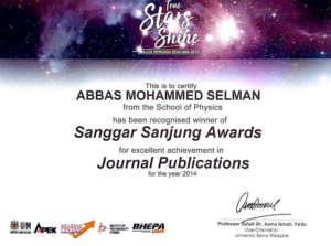 وقد حصل الباحث على الجائزة عن بحثه الموسوم A high-sensitivity, fast-response, rapid-recovery p-n heterojunction photodiode based on rutile TiO2 nanorod array on p-Si (111) المنشور في المجلة الهولندية Applied Surface Science ضمن مؤسسة نشر Elsevier .