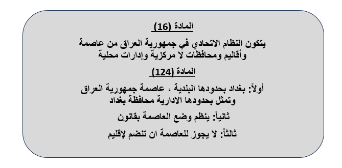 التضارب ما بين مواد الدستور قيما يتعلق بالإدارة الحضرية لمدينة بغداد أدى الى مشاكل أدت الى تأخر المدينة وتدهور خدماتها طيلة العقدين الماضية فيما استطاعت المدن الأخرى النهوض بفترة قصيرة قياسا الى العاصمة بغداد وينبغي العمل على معالجة هذا الخلل كي تتمكن المدينة من التطور والاستجابة لتطلعات اهل المدينة من خلال مجلس محافظتها.