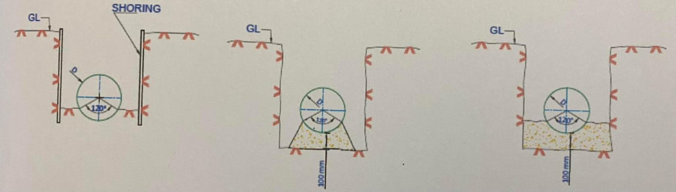 4– يجب توفير فرشة مسار للأنبوب في القاع بسمك 450 – 600 ملم في حالة التربة الطينية لتجنب الهبوط التفاضلي (Differential Settlement) او الانتفاخ للتربة (Swelling). ولا يجوز توفير وسادة للتربة الرملية.