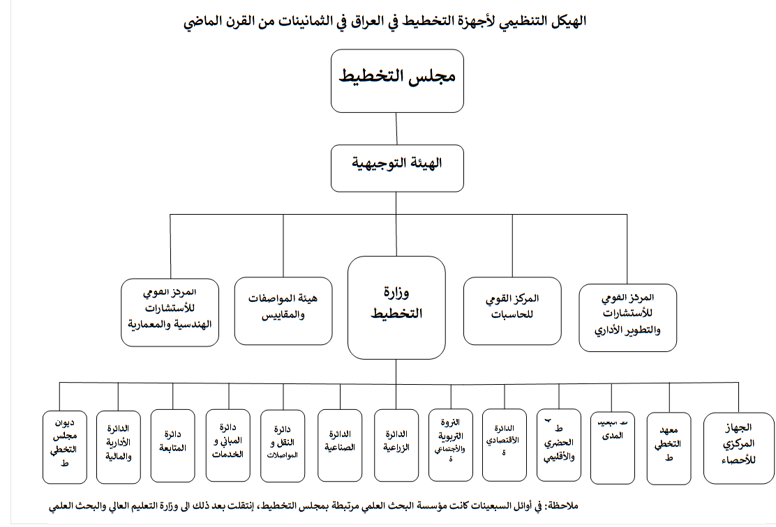 - – ويلاحظ مما تقدم أن أجهزة التخطيط للتنمية الاقتصادية والاجتماعية في العراق سواءً كانت في العهد الملكي ممثلةً بمجلس الأعمار ووزارة الأعمار خلال السنوات 1953-1958 أو في العهد الجمهوري ممثلةً بمجلس التخطيط ووزارة التخطيط خلال السنوات 1959-2003 قد حظت بما تستحقه من العناية والاهتمام من الدولة لقاء جهودها في إحكام العمل التخطيطي السليم بما قدمته من خطط خمسية وبرامج استثمارية سنوية استوفت الشروط العلمية والمهنية تم خلالها إرساء أُسس التقدم والازدهار في العراق.