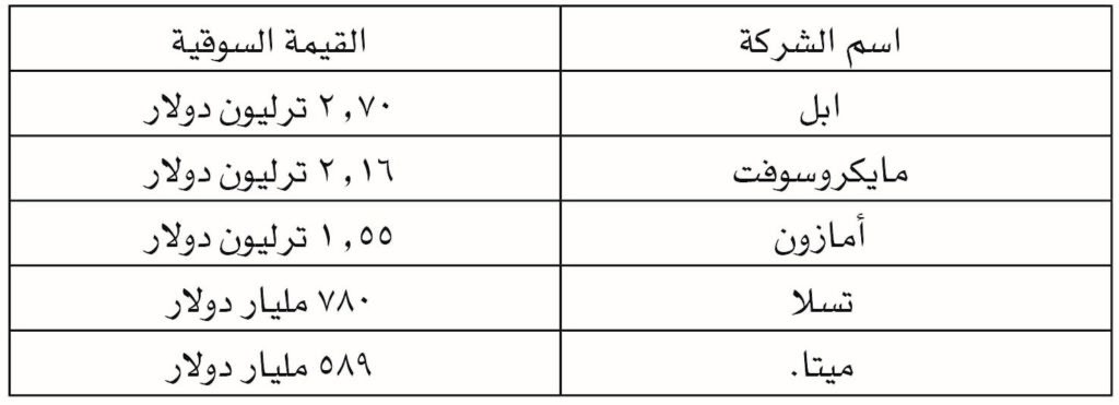 ومن اجل إدراك حجم هيمنة هذه الشركات دعونا نُمعن النظر في بعض الارقام الجدول الآتي يبين القيمة السوقية لعدد من الشركات العملاقة: