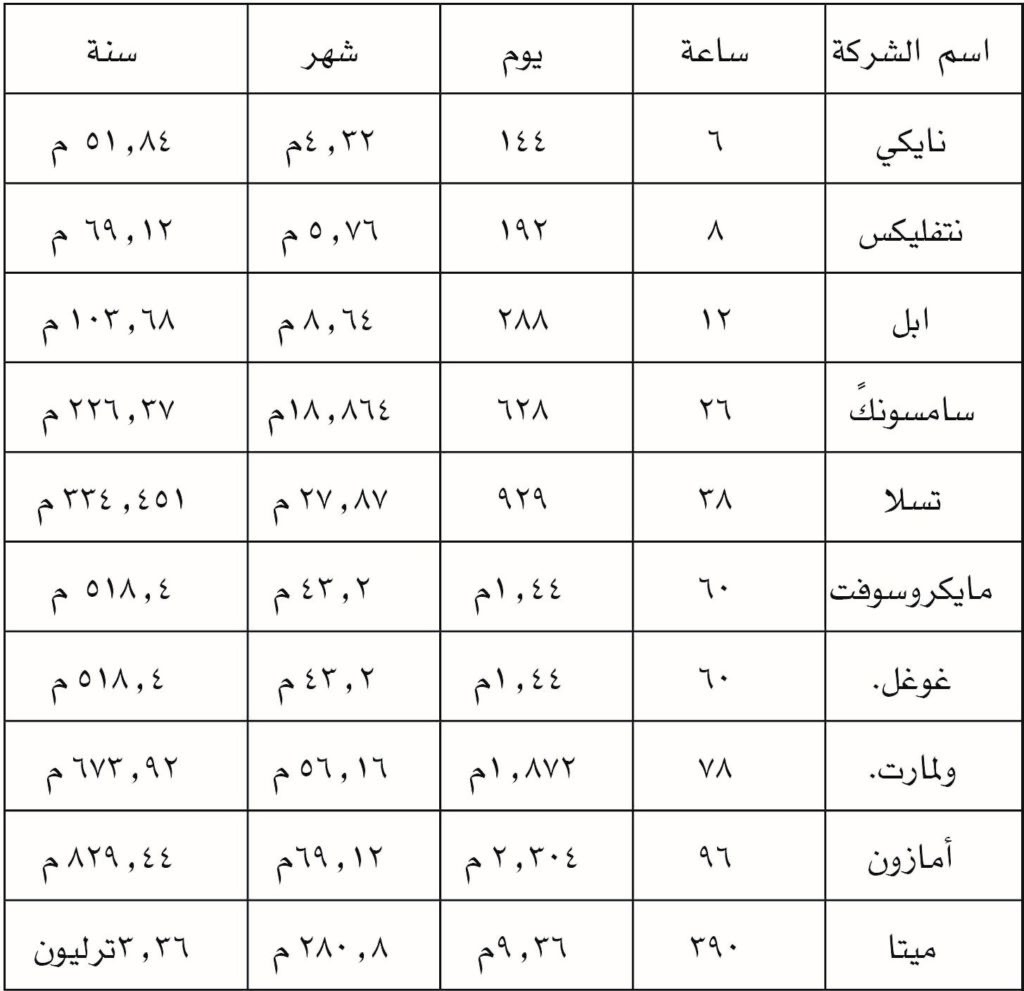 وهذا يكفينا النظر إلى بعض الأرقام لفهم مدى تغوّل هذه الشركات. كما ان أكبر عشر شركات عملاقة تجني من مبيعاتها عن كل دقيقة مليون دولار، والجدول الآتي يبين لنا أسماء الشركات العشرة وما تجنيه من مبيعاتها خلال الساعة الواحدة واليوم والشهر والسنة: