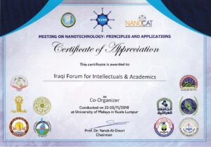 شارك المنتدى العراقي للنخب والكفاءات بصفة منظم مشارك Co-organizer في مؤتمر النانوتكنولوجي: مبادئ وتطبيقات http://siats-conf.com/ الذي أنعقد في رحاب جامعة مالايا – كوالالمبور – ماليزيا للفترة من 22-23 نوفمبر/نشرين الثاني 2018 إلى جانب المنظمين المشاركين الآخرين وهم: جامعة مالايا، جامعة السليمانية، جامعة السليمانية التقنية: جامعة تكريت، جامعة سامراء، الجامعة العراقية، جامعة النهرين، جامعة الكوفة، كلية المعراف الجامعة وكلية النسور الجامعة، إضافة إلى منظمة “معتمد” الماليزية كمنظم أساسي. انعقد المؤتمر بمشاركة أكثر من 80 باحث علمي من العراق والأردن وماليزيا وتايوان والصين وسنغافورة ونيوزلندا تتقدمهم العالمة السنغافورية جاكي ينغ الحائزة على جائزة المصطفى العالمية كمتحدث رئيس مع الأستاذ الدكتور يعرب الدوري كمتحدث رئيس أيضاً. كما نال المؤتمر تغطية إعلامية واسعة في الوسائل الإعلامية المسموعة والمقروءة والمكتوبة ووسائل التواصل الإجتماعي كمجلة “أسواق” الصادرة باللغة العربية في ماليزيا وفضائية الجزيرة العالمية. إلتزمت الجهات المنظمة بتوزيع شهادات المشاركة على كافة المشاركين بلا إستثناء وشهادات التقدير على المنظمين المشاركين في المؤتمر.