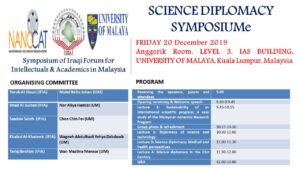 ينظّم المنتدى العراقي للنخب والكفاءات بالتعاون مع جامعة مالايا في ماليزيا في ضوء مذكرة التفاهم الموقعة بينهما “ندوة دبلوماسية العلوم” يوم الجمعة الموافق 20/12/2019 على قاعة أنجيريك ، الطابق الثالث ، مبنى الدراسات العليا ، جامعة مالايا ، كوالالمبور ، ماليزيا.