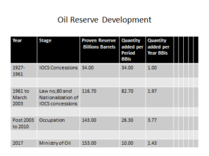 مرحلة الشركات الاجنبية 1927 لغاية 1961 تم تحديد الاحتياطي الثابت بمقدار 34 مليار برميل من خلال اكتشاف 62 تركيب ثبت منها 35 حقلا نفطيا بنسبة نجاح 52%