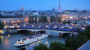 حفل الافتاح : افتُتِحَت الألعاب الأولمبية يوم ( 26 تموز ) ولأول مرة في تاريخ الألعاب الأولمبية الحديثة أقيم حفل الافتتاح خارج الملعب حيث جرت معظم الإجراءات والعروض في العديد من المعالم الباريسية وعبر نهر السين . سارت قافلة من القوارب بطول ( 6 كيلومترات ) في نهر السين عبر باريس يتقدمها قارب الوفد اليوناني وعلى متن كل قارب فريق أولمبي يمرون على معالم باريس الشهيرة قبل أن يصلوا إلى الملعب . وافتتح الألعاب رسميا الرئيس الفرنسي إيمانويل ماكرون .