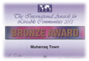 - الفوز بالجائزة البرونزية من منظمة المجتمعات الحيوية العالمية عن مشروع تطوير دوحة عراد- مدينة المحرق/مملكة البحرين، وحصلت التصفيات في مدينة شامين في الصين عام 2013.